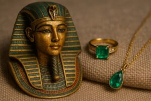 エメラルドの歴史は非常に古く、紀元前2000年頃にはすでにエジプトで採掘されていたと記録があります。特に有名なのが、クレオパトラが愛した「クレオパトラ鉱山」です。彼女は自らを“エメラルドの女神”と位置づけ、宮殿を飾り、外交贈答品としても用いたと伝えられています。