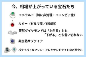 相場が上がる宝石には、「希少性」「非処理」「高品質」「産地ブランド」といった明確な要素があります。