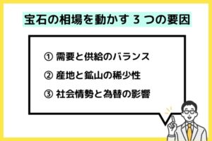 宝石は世界共通の「資産」としても扱われるため、為替や国際情勢にも左右されます。