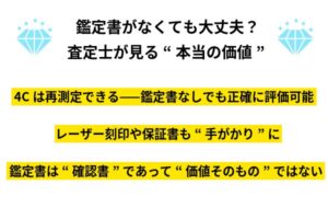 ・鑑定書は「信頼の書類」ですが、本当の価値は石の品質そのものにあります。