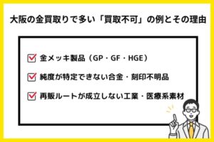 そのため、大阪のほぼすべての金買取店では金としての買取が成立しない=買取不可という判断になります。