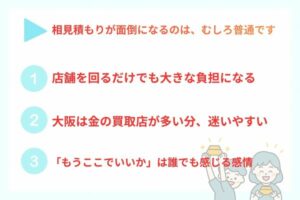 とくに大阪で金を売るときは、価格の高さだけでなく「説明がきちんとあるか」を見ることが大切です。説明不足によるすれ違いや後悔を防ぎたい方は、