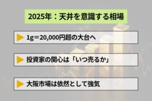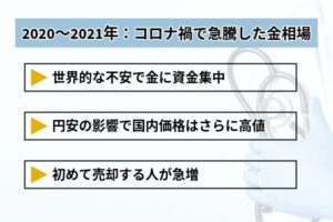 ここからは、2020年以降の相場の変化を振り返りながら「過去から現在までの金相場の流れを振り返りつつ、今後売却を検討する人が「どう行動すれば後悔しないか」を学べる内容となっています。単に相場情報を知るだけでなく、「今後の売却判断に役立つ視点」を解説します。