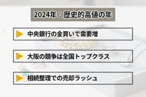高齢層の資産整理や相続需要も加わり、買取件数は急増。大阪市場はかつてない盛り上がりを見せました。