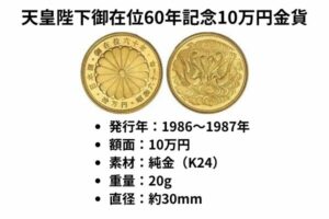 この金貨は、平成の幕開けを祝して発行された純金製の記念貨幣です。正式名称は「天皇陛下御在位60年記念10万円金貨」。