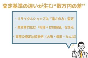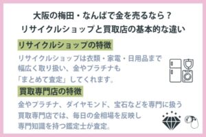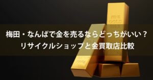 このコラムでは、大阪の梅田・なんばで金を売る際に「リサイクルショップ」と「金買取の専門店」でどれほど査定額が変わるかを実例付きで解説しています。