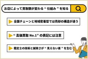 そのため、最低2店舗以上で査定を比較するだけで、「損を防ぐ」「適正価格を知る」「店の誠実さを見抜く」ことが可能になります。