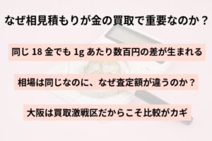 一方、ゴールドウィンのような都心部で相見積もりが大前提の買取店では、当日の国内金相場や為替レートをリアルタイム反映して査定しています。このわずかなタイムラグが、1gあたり数百円の差になる場合があります。これが「相見積もりを取るべき」最大の理由です。